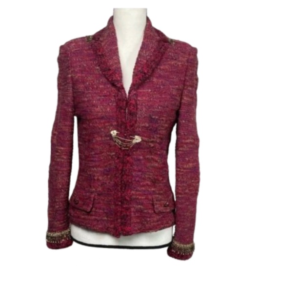 ST. JOHN couture Tweed Jacket Rich Burgundy gold crystal chain beaded fringe
