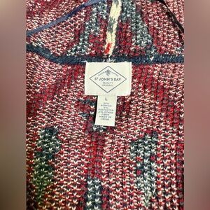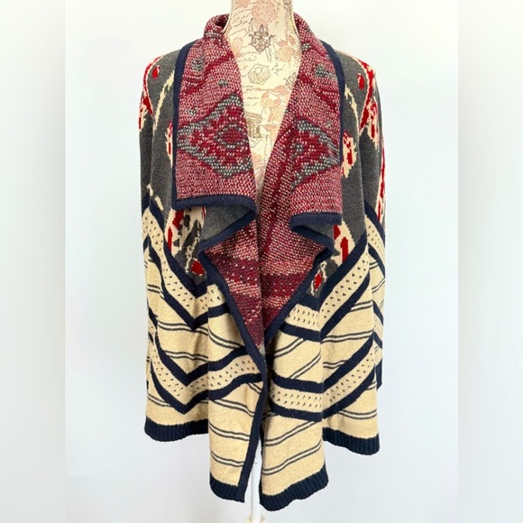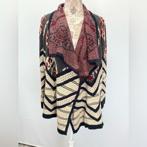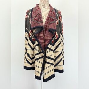 ST. JOHN’S BAY Beige gray red IKAT knit waterfall collar cardigan size L