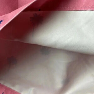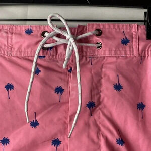 ST JOHNS BAY MENS SIZE XL SWMI TRINKS PINK WITH BLUE PALM TREE DESIGN ELASTIC DRAWSTRING WAIST POCKETS SOME DISCOLORATION ONE SIDE BUT ON GOOD CLEAN CONDITION LENGTH MEASURES APPROX 20” FROM WAIST TO HEM INSEAM MEASURES APPROX 9” WAIST MEASURES APPROX 20” FROM SIDE TO SIDE