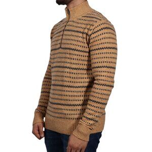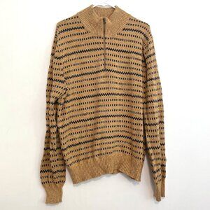◇ size Mens large. Tan brown and white / darker brown marled with navy blue ish and/or faded black ish (hard to tell) geo print geometric print rectangle print making up horizontal striped print. Fuzzy ish. Knit. Solid contrasting cuffs/hem/neck. Foldover collar collared / mock neck and long sleeve. 1/4 zip pullover sweater / quarter zip pullover sweater