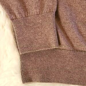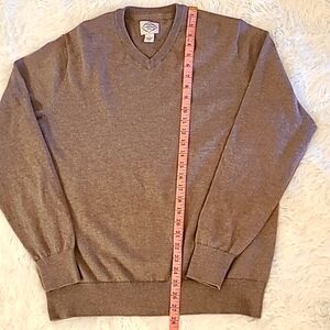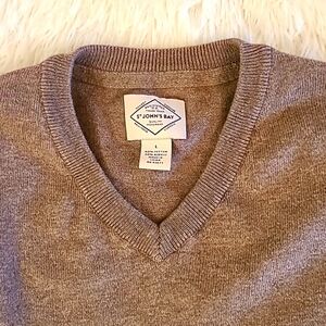 The product is a pre-owned St. John's Bay men's V-neck pullover sweater in tan color, size large. This sweater is made of tight-knit fabric with long sleeves, making it perfect for the winter and fall seasons. It is machine washable and designed for regular fit. The classic solid pattern and V-neckline add a touch of style to this versatile and comfortable sweater.