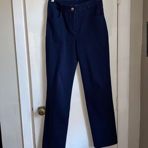 A goldtone logo plaque discreetly details one of the back pockets on versatile Navy Blue straight-leg pants in a sturdy stretch twill.