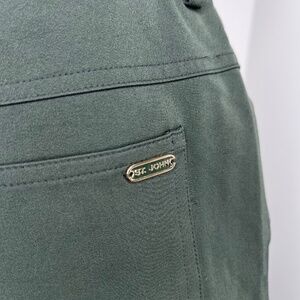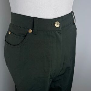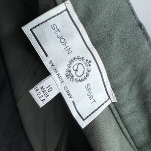 Size 10. In excellent condition. Material is a performance feel polymide. Much like the feel of lululemon trousers. Deep hunter green in color with Gold hardware. St. John emblem at back pocket. High rise straight leg.