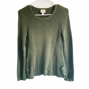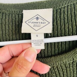 St John’s Bay Olive Ribbed Long Sleeves Sweater size small in excellent condition no flaws, ribbed knit, crisscross details on hem sides, check all pictures for details.