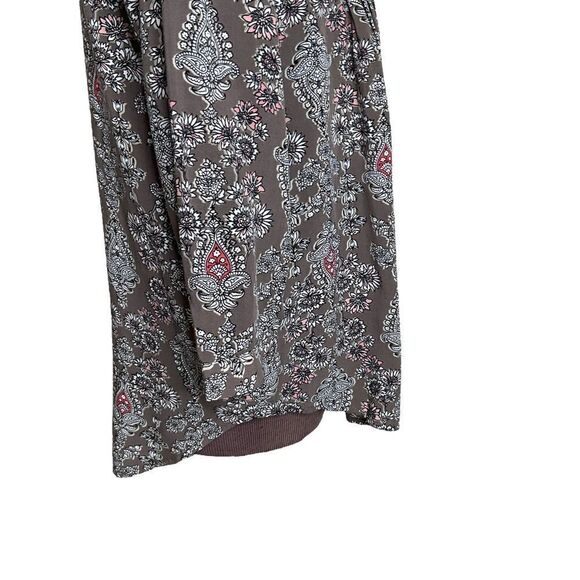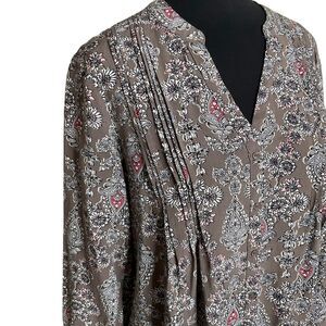 A very pretty St John's Bay tunic style top with pleating in the front. V-neck. 3/4 sleeves. The fabric is a floral and paisley print. Excellent used condition.