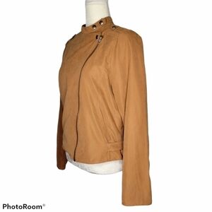 Super cute zip up jacket with snap buttons, brown/tan, fully lined, poly/nylon, size large.