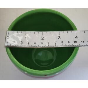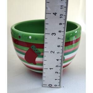 Set of 3 stacking bowls from Boston Warehouse Trading Co. These have a winter/holiday theme. They are green, red and white stripes. There are a red and a green mitten on one side of each bowl. The bowls diameter are 6", 5" and 4". The two larger ones have a white interior and the smaller one has a green interior. They are a nice set of 3 festive bowls.