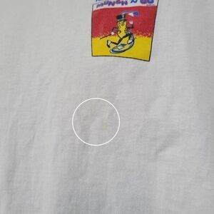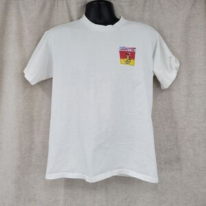 90s White Single stitch Tee with red and yellow graphics. Planters Peanuts munch and go. A few light spots shown in photos.