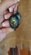 Stained glass style skull and roses beneath cabochon glass. Vintage goth frame and hypoallergenic wires.