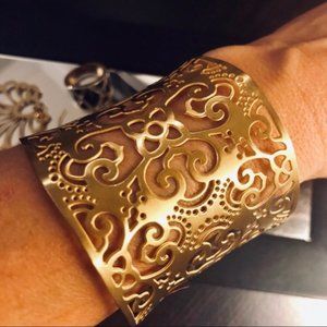 STAINLESS STEEL GOLD Exotic Cuff – a stunning piece that speaks volumes with its dynamic designs and enduring elegance. Crafted entirely from stainless steel in a radiant yellow gold finish, this cuff promises everlasting brilliance without tarnishing or fading. The adjustable design ensures a perfect fit for any wrist size, while the bold dimensions of 2 inches in height and 6.75 inches in width make a statement that's both bold and sophisticated. Elevate your style with this exotic cuff – a timeless accessory that merges glamour with durability. Your exclusive touch of luxury awaits.