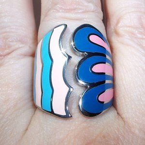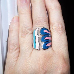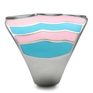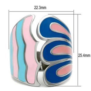 Sizes 7-10 only. NWT Stainless Steel Ring. This unique women's fashion open front ring is a wave design with pink and blue epoxy detailing. This ring is 25.4 (mm) wide at its widest point. Solid TK316 Stainless Steel (no plating) is high polished to a mirror finish. Stainless Steel Jewelry is hypo-allergenic, non tarnish and never turns your finger green. It is a darker metal than sterling silver.