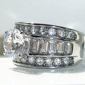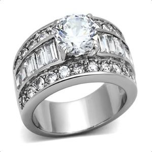 NWT Stainless Steel Ring. This gorgeous women’s Fashion Ring has an 8 (mm), 2 carat round cut stone in the center with baguettes and round stones on the band. The graduated band is 12.6 (mm) wide at its widest point. All stones are AAA Grade CZ’s and have lots of sparkle. Solid TK316 Stainless Steel is high polished (no plating) to a mirror finish. Stainless Steel Jewelry is hypo-allergenic, non-tarnish and never turns your finger green. It is a darker metal than Sterling Silver.