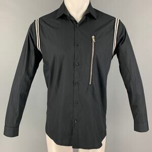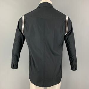 STAMP long sleeve shirt comes in a black cotton featuring a ribbed stripe trim, spread collar, zipper pocket, and a button up closure.