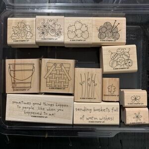 Set of 13 wood mounted rubber stamps. 2 Step Stampin. Please note these have been lightly used. This was a Hostess set and is retired. Cards are not included, just pictured to show examples.