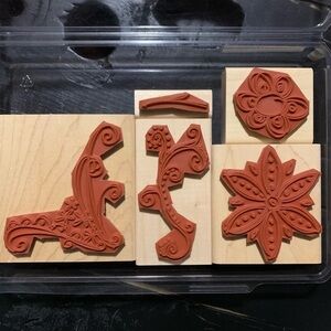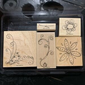 Set of 5 wood mounted rubber stamps. Sold from Fall Winter 2007 - Spring Summer 2009. Never used. Samples are not included, just pictured to show examples.