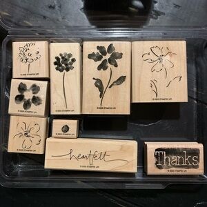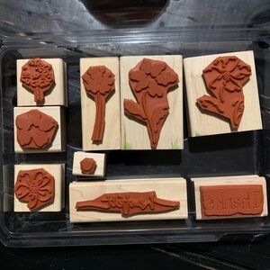 Set of 9 wood mounted rubber stamps. Part of the Definitely Decorative 2 Step Stampin collection. From 2005 - Spring Summer 2009, retired. Lightly used. Samples shown are not included, just pictured to show examples.