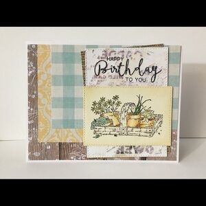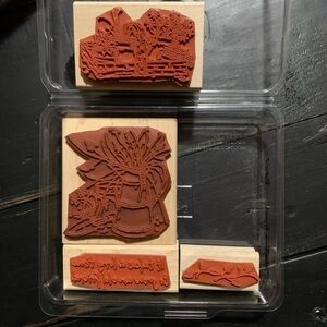 Set of 4 wood mounted rubber stamps. Please note these have been used. From 2006 Spring Mini Catalog. Retired. Cards are not included, just pictured to show examples.