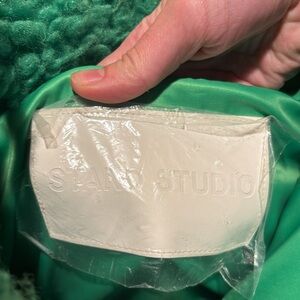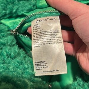 Stand Studio Leia faux fur cloudy bag. Comes with a removable crossbody strap. Small stain on inside that looks like makeup and small tear on inside by the crossbody strap. This looks like it can be sewed easily. No other callouts.
