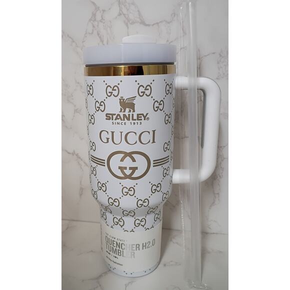 * Design: White base with a gold-tone repeating "GG" pattern and the Stanley brand logo.