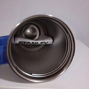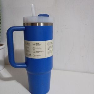 Durable blue mug with handle and straw. Ideal for travel.