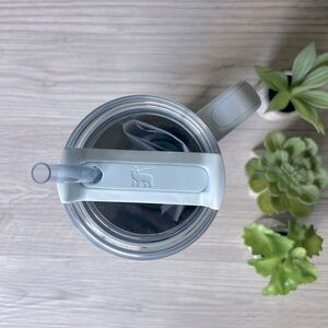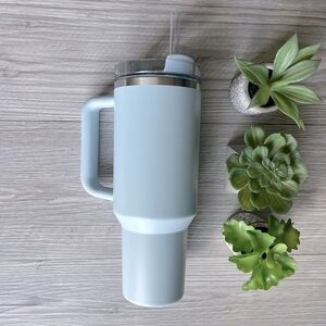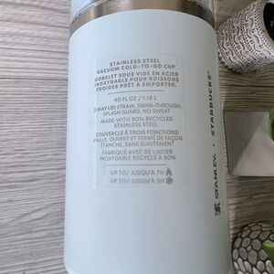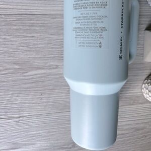 STANLEY + STARBUCKS stainless steel vacuum cold-to-go cup. Spring 2024 Limited Edition tumbler. Light blue color with grey lettering. Three way lid: straw, drink-through, splash guard, no sweat. Keeps liquid warm for 7 hours. Keeps liquid cool for 5 hours. Care and use guide included. New with tags.
