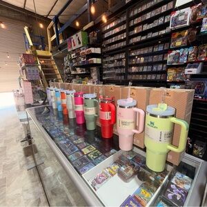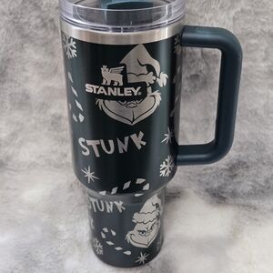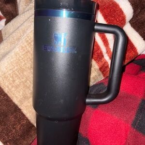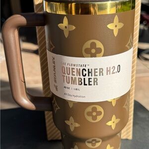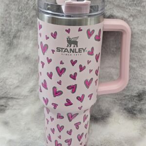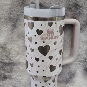Stylish black tumbler with heart design. Features a convenient handle and flip straw.