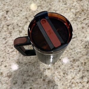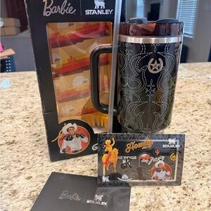 Elegant Stanley travel mug in black with silver patterns. Featuring’80s Western Ken Limited Edition. Durable and stylish design.