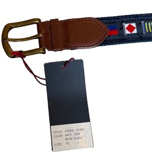 The STAR CLIPPERS Men's Signal Flags Navy Tape w/Flags Belt in size 42 is a stylish and functional accessory for men who love boating. The belt features embroidered boating flags design, a buckle closure, and adjustable sizing for a comfortable fit. The multicolor tape with signal flags adds a unique and nautical touch to any outfit, making it a perfect choice for those who appreciate a boating theme in their fashion.  Belt is brand-new with tags!