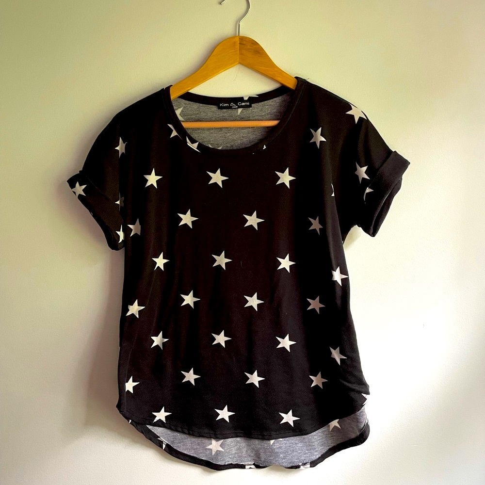 Size small. Worn once. Slight high-low hemline. Black with white star print. Excellent condition.