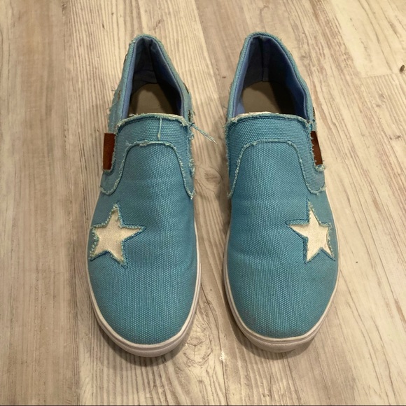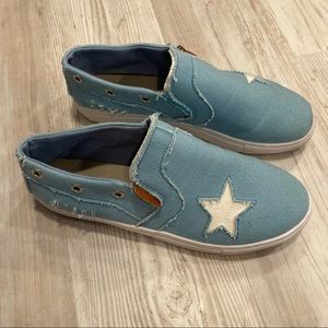 Super cute star canvas slip ons! No label or foot bed (very flat), between 8-8.5. Canvas outer, rubber(?) bottom.
