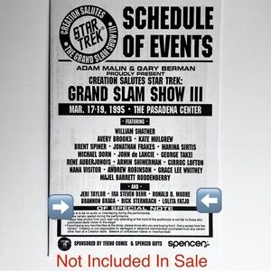 The collector I obtained this vintage signed photo from went to the Star Trek Grand Slam Show III held in Pasadena from March 17-19 in 1995. He acquired a lot of autographs which he held on to for 20 years until he sold them to me. He included the vintage convention pamphlet (see photo) he kept all those years which lists the names of the celebrities who were attending the convention (the pamphlet is not part of this offering).