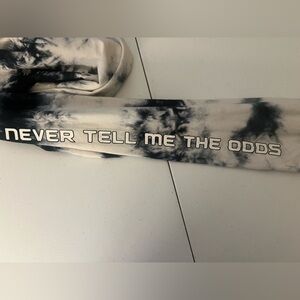 Black and white tie-dye shirt with bold text on the collar. Comfortable and stylish. Very soft fabric.