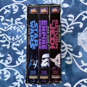 This Star Wars VHS Video Tapes Box Set was released in 1995. THX Digitally Remastered Sound. Contains 3 tapes - Star Wars A New Hope, The Empire Strikes Back and Return of the Jedi. Good Condition with minor marks on the box as pictured.