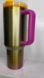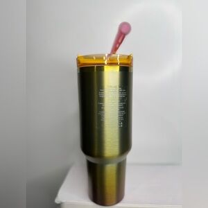 The Starbucks SS VAC Tumbler Stanley Quencher PVD 40oz Sum Fy24 is a 40 oz stainless steel tumbler that features a striking pink and yellow color scheme. It is made from 90% recycled 18/8 stainless steel and is BPA-free. The tumbler has double-wall vacuum insulation and a powder coat finish. It is versatile and can be used for a wide range of beverages, including coffee, tea, smoothies, and juices.