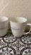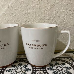STARBUCKS 2008 Abbey set of 2 white brown print coffee mugs EST 1971 18 oz