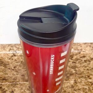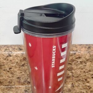 Starbucks Christmas Collection Travel Tumbler Mug, featuring snow and snowflakes scene with cute dog and kid sledding in holiday colors: red and white. Bottom of tumbler indicates 2009, insert indicates 2011. Pre-Loved in Very Good Condition, from my sister-in-law's private collection. Smoke Free Home. Tumblers are shipped in a box, USPS Priority Mail, for the best protection.