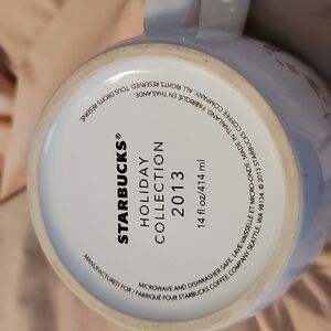 Starbucks Holiday Mug features Logo Mermaid in Green with Gold Snowflakes and STARBUCKS in Black on other side of Mug.