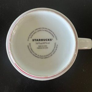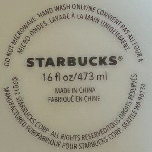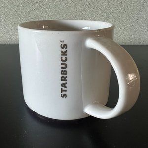 Classic pearl white Starbucks mug with a red ringed raised base and vertical STARBUCKS logo in metallic gold lettering. This timeless 2012 ceramic mug will make the perfect addition to your collection. Measures 3.5” tall with a 4” diameter. Holds 16 fluid oz. From Starbucks Coffee Company; 2012.