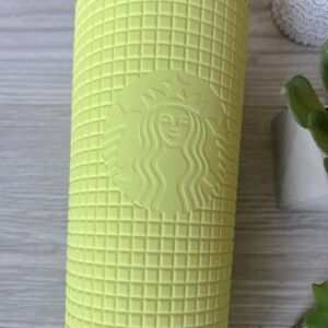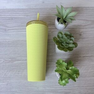 Starbucks Winter 2023 Meadow Yellow Soft Touch Matte grid tumbler. Sealed lid. Straw included. Size venti; holds 24 fluid ounces. Discoloration on the bottom of tumbler, shown in photos.
