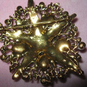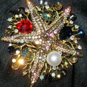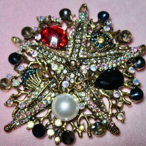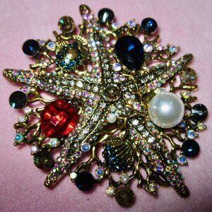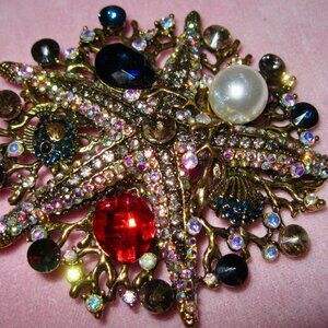 10/14/25...PRICE JUST REDUCED..."STARFISH BROOCH W/FISH AND OYSTER AND MANY SPARKLING HIGHLIGHTS"...This exquisite brooch offers all the colorful stones and it's a real gem! Notice the blue fish and the oyster as part of the ocean underworld of adventure! It measures almost 3" overall and as a locking clasp on the back. The many colorful stones make this piece totally Awesome! Notice the Aurora Borealis stones in the starfish and more scattered about. The lucky buyer will receive the brooch after receipt of order and ship out the following business day via USPS Advantage mail in a FREE gift box. Any questions, please feel free to ask.P.S. Please note the first photo is with a flash so it's a bit lighter than the others.