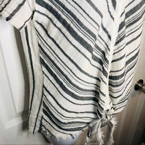 Stark X Short Sleeve Tie Knot Blouse Gauze top. V-Neck Stripe Ivory White Grey Size Small. Short sleeves. Diagonal stripes in front, horizontal on side and back. 100% Cotton. Ties in knot on front. Coastal Grandma Casual Breezy Lightweight Cool Beach Vacation Resort Wear Date Spring Summer. See last photo for how i do measurements they are apprx and on one side. Gently used Excellent Preowned Condition..