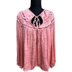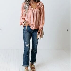 We have no doubt this darling peach colored top will become a staple in your wardrobe with its sleek lightweight and flowy material, cute ruffled and cinched detailing around the shoulders, a v-cut neckline with a tie-closure, long bubble sleeves, and a relaxed silhouette that falls into a straight hemline!
