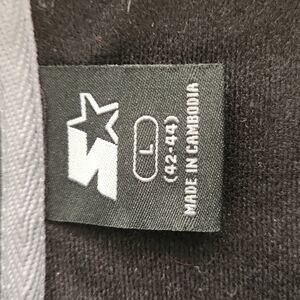 Black with gray and white stripe down shoulder and sleeve Starter lightweight winter jacket. Size Large. 100% Polyester. In excellent condition.