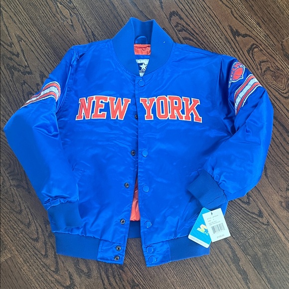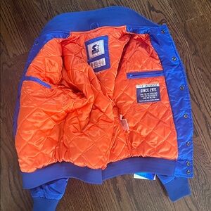 Bold blue bomber with New York text. Orange details on sleeves. Classic sporty style.