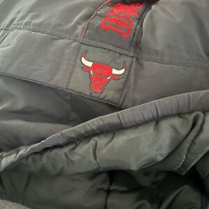 Bold black jacket with Bulls logo. Red and white stripe details. Perfect for fans. Everything works. All zippers and buttons are functional. No tears or holes. In mint condition. DISCLAIMER *Size large - but fits like medium*