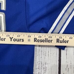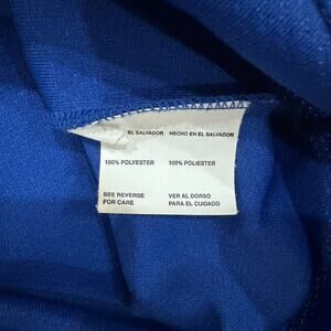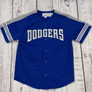 Blue jersey featuring Dodgers text. Gray sleeves with stripe detail. Button-up front.