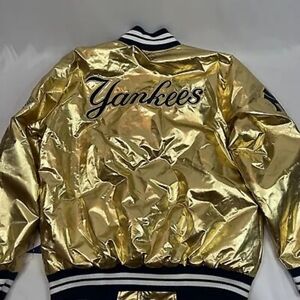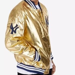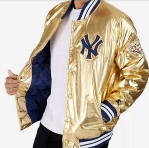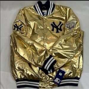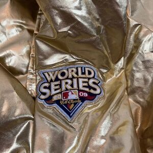 Gold and Dark Blue Jacket featuring the New York Yankees team logo, Officially licensed by STARTERS for the 2009 World Series event. Made in China, designed for fans of Major League Baseball.