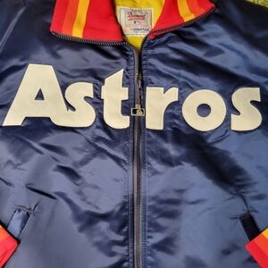 Vintage Rare Diamond Collection by STARTER, MLB Houston Astros Starter Satin jacket, satin blue with red/orange/yellow at neck, wrists and waist, zip up front, fully lined, size medium.