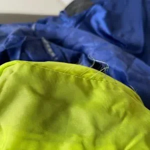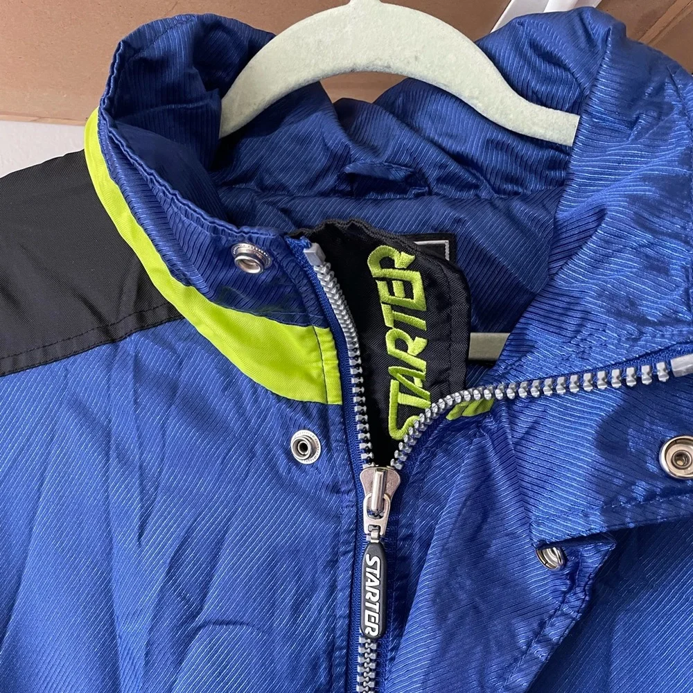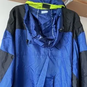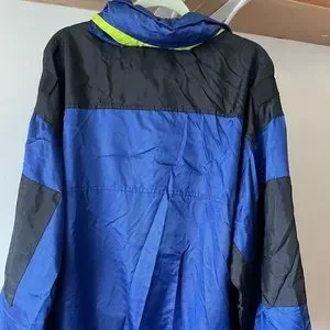 Lightweight jacket, with hoodie, kangaroo and side pockets, and Velcro wrist adjustments. Damage on collar stitch, bottom inner lining, and hoodie holder/pocket, inside of hoodie is also discolored. Loose threads on shoulders. Right side pocket zipper does not zip down all the way