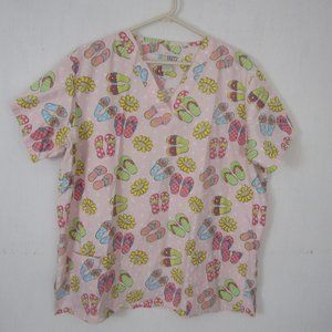 Medical scrub shirt features beachy colorful flip flops! NOTE: this item is marked large but measures bigger..check the measurements in the picture section